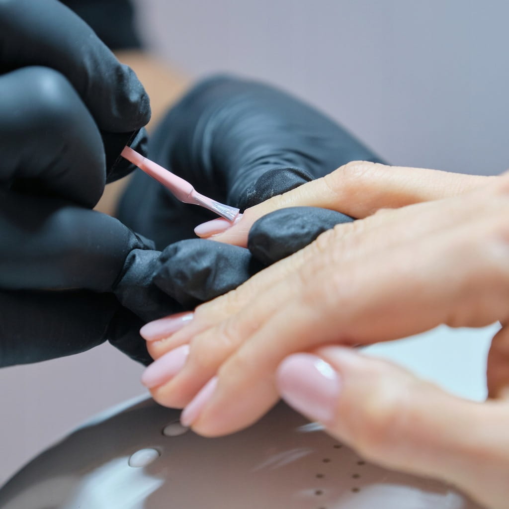 Na utwardzoną bazę nałożyć kolorowy lakier hybrydowy.