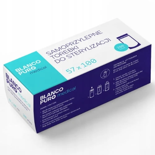 Blanco Puro to profesjonalne, samoprzylepne torebki do sterylizacji przeznaczone do procesu parą wodną (STEAM) oraz tlenkiem etylenu (EtO). Wykonane z wytrzymałego papieru medycznego 60 g/m² i przezroczystej folii, umożliwiają łatwą identyfikację zawartości oraz kontrolę procesu sterylizacji dzięki podwójnym wskaźnikom chemicznym zgodnym z EN ISO 11140-1.