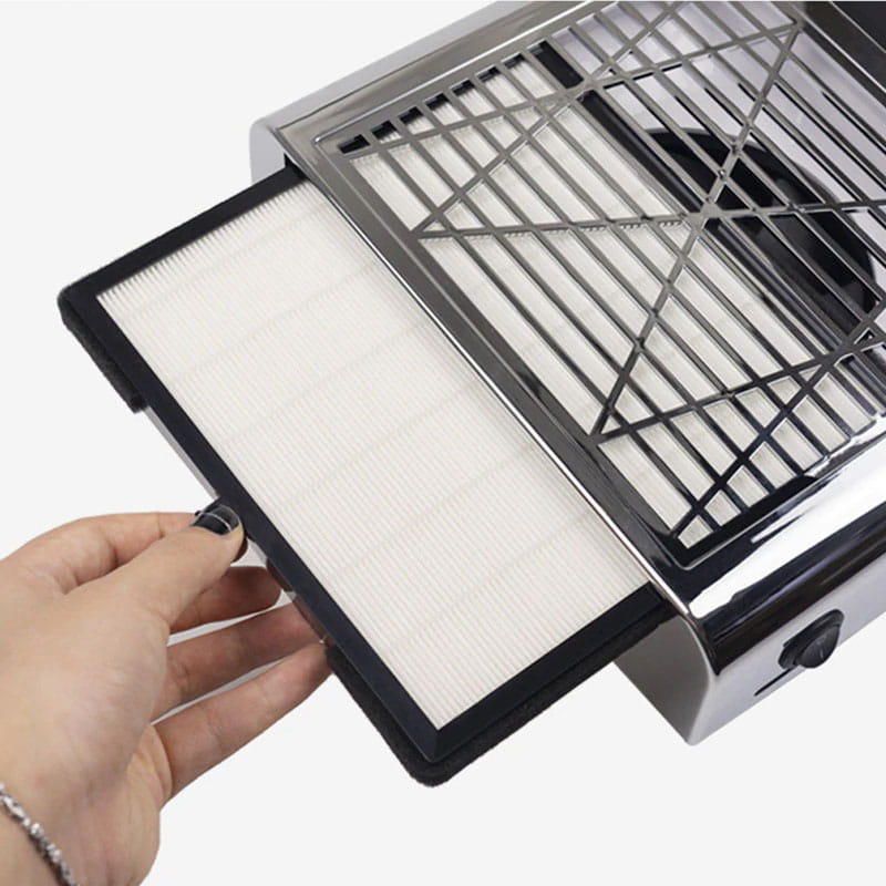 Filtr jest wielokrotnego użytku – wystarczy czyścić go po każdym manicure poprzez wytrzepanie lub wydmuchanie pyłu (np. suszarką lub sprężonym powietrzem).