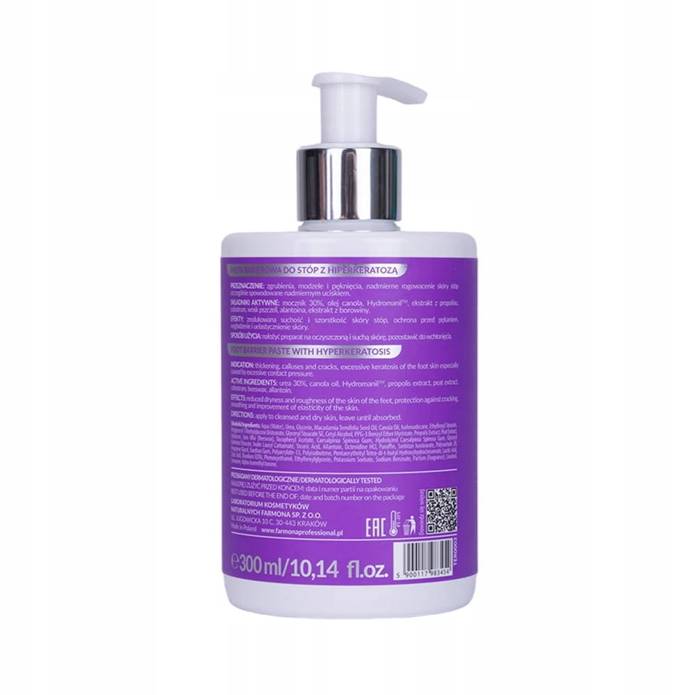 Profesjonalna pasta barierowa Farmona Podologic Therapy skutecznie chroni i regeneruje stopy z nadmiernym rogowaceniem, modzelami oraz pęknięciami. Formuła z 30% mocznikiem, olejem canola, ekstraktem z propolisu i alantoiną intensywnie nawilża, wygładza i uelastycznia skórę, redukując suchość i szorstkość.