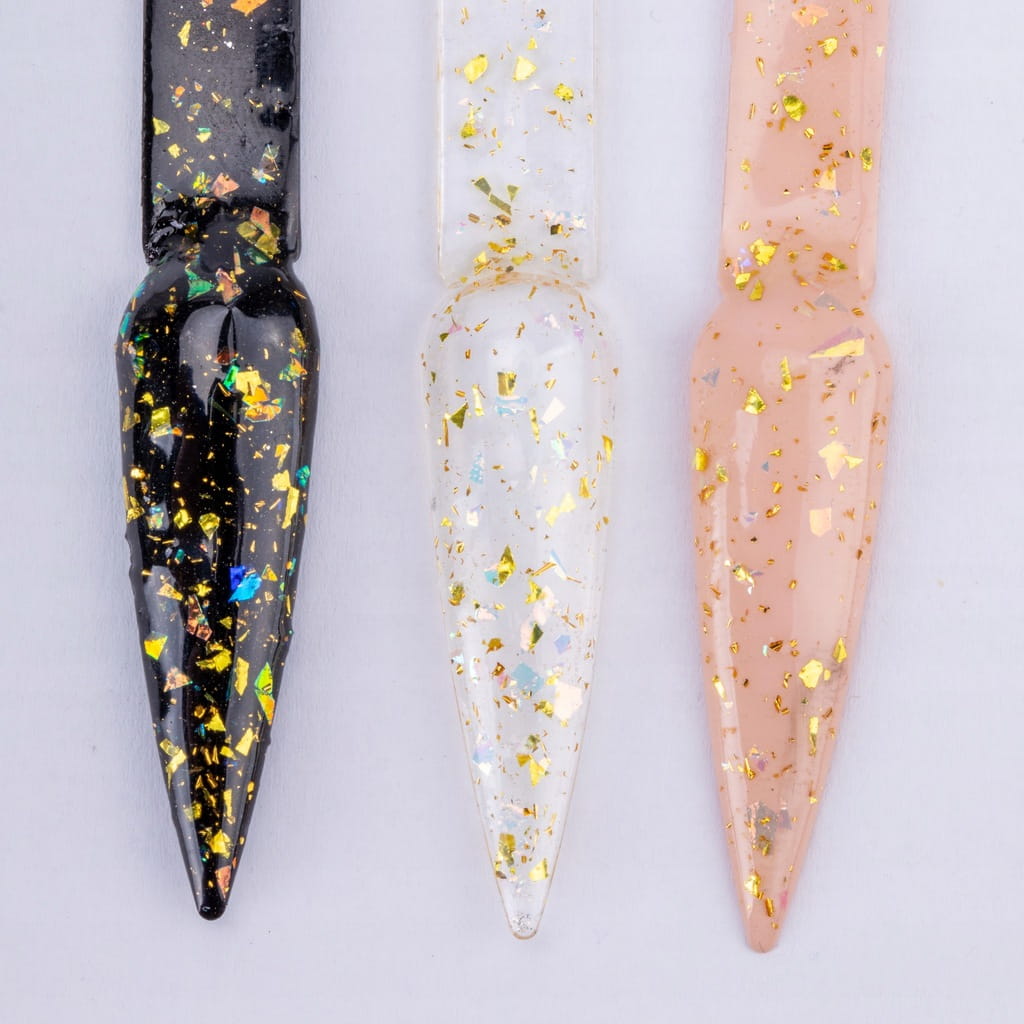 Złote, nieregularne drobinki zmieniające kolory pod kątem światła